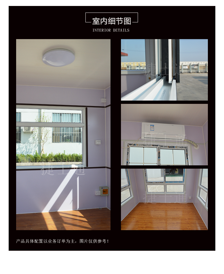室內(nèi)鋪有暗線,接電即可使用,地面鋪有復(fù)合木地板,屋頂PVC吊頂,還設(shè)有工作臺,防漏電保護器,照明燈、燈孔開關(guān)。外觀建議尺寸:1.5*2米、2*2米、2*3米、2.3*4米......其他尺寸均可設(shè)定