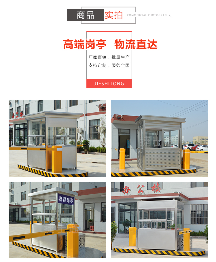 酒店收費崗亭結構與用材 :1、酒店收費亭主體結構:采用基多10#鍍鋅槽鋼管或不銹鋼管、其他規格鍍鋅鋼管為龍骨滿(mǎn)焊接成型,柔性強不易損壞、強度高、抗風(fēng)壓、方便移動(dòng)不易變形;